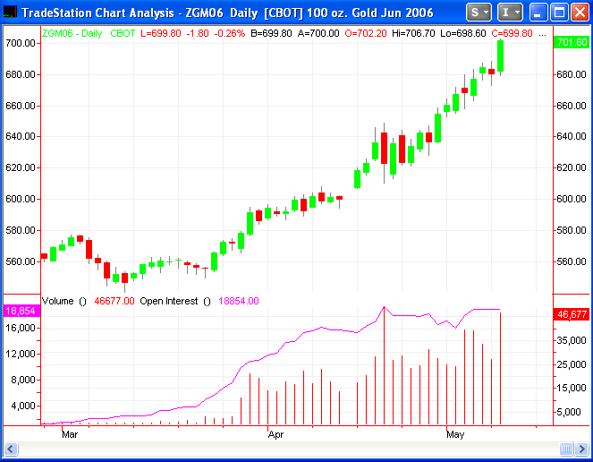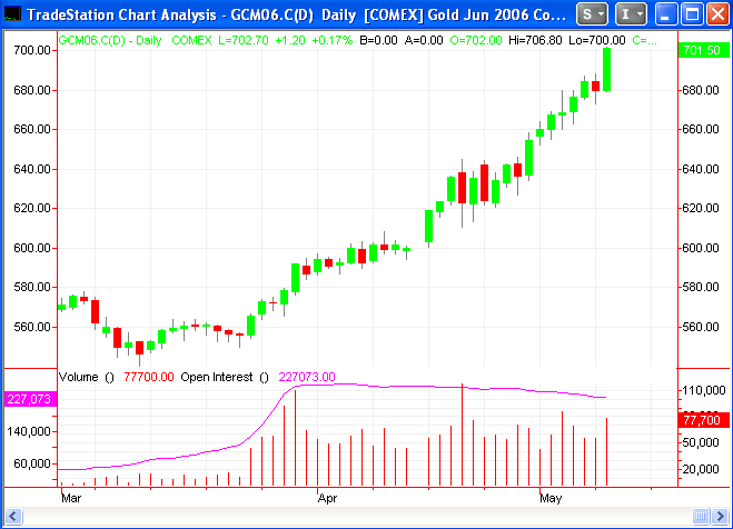 Trh roste ve vlně [v] na nová dlouholetá maxima, jak vidíme na grafu červnového kontraktu. Jistota předpovědi pro zlato: dlouhodobá: střední, krátkodobá: střední. (zdroj: ElliottEdge 8.5.2006 )