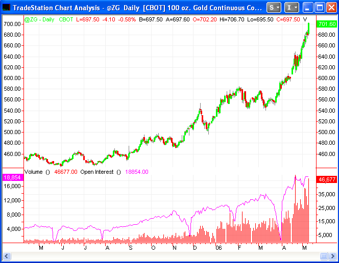 Jak je vidět, specifikace futures kontraktu ZG (chicagské zlato) je stejná jako u newyorského kontraktu GC. Navíc výhody pro běžného spekulanta jsou všechny na straně ZG - 100% elektronické obchodování (tj. vynechání všech neduhů parketových obchodníků), levnější komise, nižší marginy, rychlá plnění atd. Jediným - a bohužel podstatným - omezením u podobných trhů tak bývá likvidita. Tento problém pak trochu připomíná začarovaný kruh - přestože burza nabízí zajímavé podmínky, nikdo zde neobchoduje především proto, že je zde málo realizovaných obchodů ... Naštěstí se ale tento kruh podařilo CBOT prolomit a futures kontrakt ZG láme postupně od začátku letošního roku rekordy ve stále vyšším a vyšším denním volume. Názorně si to můžeme ukázat na denním grafu zobrazující obchody od poloviny roku 2005 do dnešních dnů: