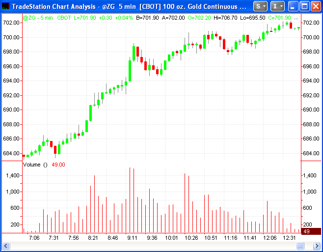 Intradenní průběh 5ti minutového grafu futures kontraktu ZG. Zlato dělá často velmi pěkné trendy o velikosti tisíc až dva tisíce dolarů za den.
