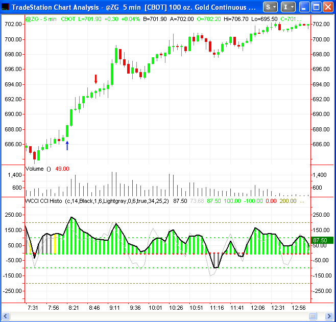 Zkoušíte-li obchodovat podle WoodieCCI systému, rozhodně zlato nepřehlížejte. Doporučuji zkusit testovat ZLR do silného viditelného trendu a to většinou pouze první ZLR nejlépe v první části obchodní seance. Řadu dní tento jediný pattern nabídne při rozumném SL (řádově 100-120 USD) profit několik set až cca 1000 dolarů. Na obrázku vstup na ZLR (osobně mi fungují v trhu i ZLR nad 100 linkou a výstup při protnutí CCI 100 linky).