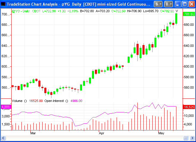 Jak jsem se již zmínil výše, na CBOTu se obchoduje nejen "plný" kontrakt zlata, ale i zmenšený (tzv. mini) kontrakt - určený především pro začínající obchodníky s menším účtem. Na Finančníkovi jsme se o mini zlatu již několikrát zmiňovali - v principu je tento trh pochopitelně hodně lákavý pro začínající obchodníky, problém byl vždy likvidita. Nicméně i ta se poslední dobou velmi zvyšuje a YG futures se začínají pomalu dostávat do hledáčku obchodníků. Začněme tradičně specifikací: