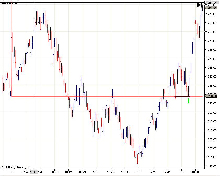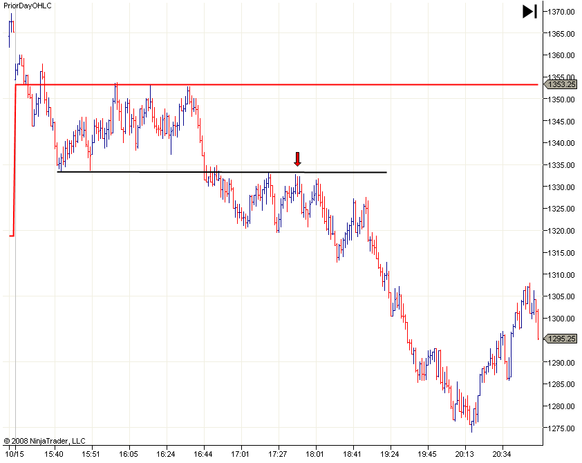 Jaký trh pro obchodování DT/DB? Formace opět fungují na všech trzích a pochopitelně i velmi dobře na futures na akciové indexy, které používáme pro intradenní obchodování. Protože je tento článek určen především začínajícím traderům, budu ukázky demonstrovat na trhu NQ – e-mini Nasdaq, který bývá velmi klidný (samozřejmě v době dnešních finančních turbulencí je i tento trh nezvykle dravý, ale to se uklidní) a často jej traderům pro sledování podobných formací doporučuji. Konkrétně zvolíme s tímto trhem timeframe Volume 1500, který pro intradenní obchodování tohoto trhu používám (ale je samozřejmě možné si zvolit libovolnou jinou hodnotu, formace jsou obchodovatelné na libovolném timeframe a někomu může vyhovovat např. rychlejší timeframe).