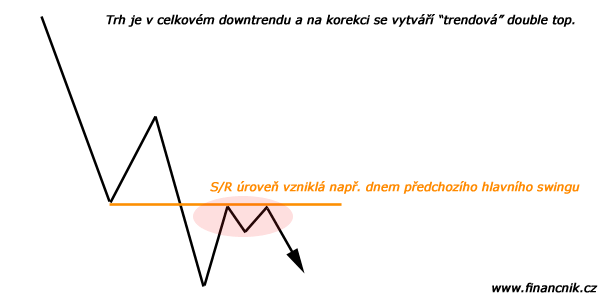 Trh je například v downtrendu, vytváří korekce jejichž dna tvoří přirozené S/R úrovně. Poté se pokusí znovu na danou S/R úroveň zaútočit, nicméně ta drží a vytváří se zde „trendový dvojitý vrchol“, v rámci které nastupuji do shortu: