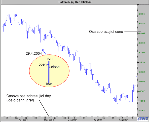 Graf zobrazuje průběh obchodování bavlny. Jde o denní graf, kde každá jednotlivá "čárka" zobrazuje průběh obchodní seance jednotlivého dne. Vidíme, že graf zobrazuje obchodování komodity někdy od poloviny března (anglicky March) přibližně do poloviny srpna (anglicky August) - viz. spodní osa x. Na svislé ose y pak vidíme ceny, za které byla komodita v různé okamžiky obchodována. V rámci celého grafu je tedy patrné, že cena prosincové bavlny (dec cotton) od poloviny března padala z cca 69 USD dolarů na 42 USD, pak se odrazila a skončila na hodnotě 51 USD. V červeném kruhu je zvýrazněný a zvětšený jeden náhodně vybraný den – konkrétně 29.4.2004. V každém rozumném zobrazení grafu (i na internetu jsou jich desítky zdarma) je možné snadno odečítat hodnoty jednotlivých dnů, takže můžeme s jistou říci, že 29.4. bavlna otevřena na hodnotě 61,55 USD (open), nejnižší obchodovaná hodnota byla 59,10 USD (low), nejvyšší cena v rámci tohoto dne byla 61,95 USD (high) a trh uzavřen na ceně 61,25 USD (close).
