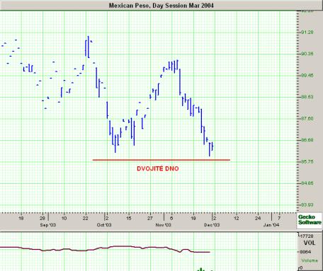 Obr. 1. Na denním grafu MEXICAN PESO (MQH04) je vidět dvojité dno, na jehož základě se obchodník rozhodnul vstoupit do dlouhé pozice.