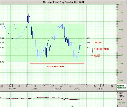 Obchodník trpělivě projíždí každý večer aktuální grafy několika trhů, dokud se patřičná formace v některém z nich neobjeví. V našem případě narazil na formaci dvojité dno obchodník A dne 28. listopadu 2003 v březnovém trhu MEXICAN PESO (MQH04) - viz. obrázek 1. Rozhodl se tedy do trhu vstoupit, nakoupil 1 kontrakt a držel ho s cílem kontrakt prodat v momentě, kdy se cena dostane k 50% retracementu, nebo-li v polovině svého předchozího pohybu (retracementu se budeme podrobněji věnovat na serveru v samostatném článku).