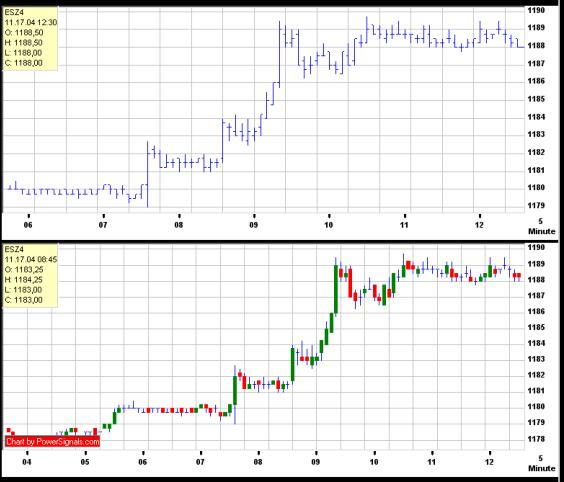Na obrázku 3 vidíme, screenshot intradenního grafu tohoto trhu. Obchodník používá pro své obchodování 5 minutové grafy (na ukázce obchodník používá jak "klasický" graf-viz. nahoře, tak takzvaný "candlestick" graf-viz dole).