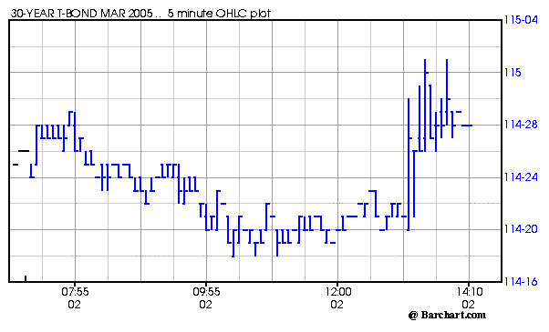 Typická ukázka trhu s hyper-rychlým pohybem, který šel navíc očekávat. Graf pochází ze včerejšího (2.2.2005) obchodování v USH5 (30leté dluhopisy). Všimněte si, jak trh zareagoval na report týkající se zvýšení úrokové sazby ve 13:20. Trh začal neskutečně "lítat" - jeden tick přitom představuje 32 dolarů a určitě nebyl problém získat v takovém trhu skluz i více než 5 ticků. Obdobím s ohlášenými reporty je proto vždy lepší se - zejména v prvních fází obchodování - rozhodně vyhýbat.