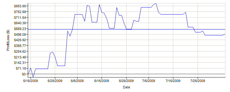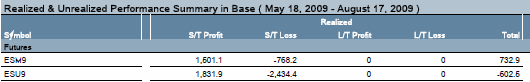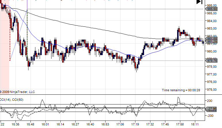 Ukázka trhu ES z pondělí 17.8.2009. ES otevřelo velký gapem dolu, udělalo ještě trochu pohyb v rámci svého otevíracího rozpětí, ale potom se již pohybovalo ve velmi nebezpečném chopu. Trh se motal kolem EMA34 a neměl sílu prorazit range otevíracího rozpětí. V takovém trhu se pochopitelně velmi těžko obchodují trendové strategie. Osobně jsem neudělal za celou seanci jediný obchod. Prázdninové měsíce přináší celou řadu podobných dnů a začínající obchodník se především musí naučit "stát stranou".