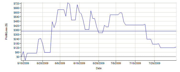 Pavlovo obchodování dobře dokládá, jak je důležité se především v intradenním tradingu zaměřit na dostatečný průměrný zisk na obchod, aby komise nepředstavovaly příliš vysoký náklad v poměru s průměrným ziskem. Nahoře obchodní výsledky bez započtených komisí, spodní graf s komisemi.