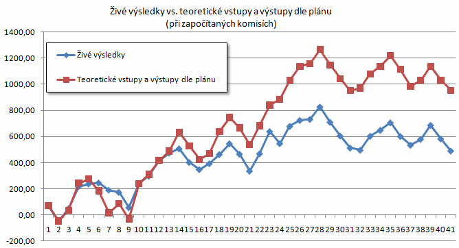 Pavel by měl vstupovat na close vstupní úsečky (jednominutového grafu). Následující graf porovnává reálné výsledky obchodování (modrá linka) s teoretickou situací, kdy jsme pro výpočet vzali reálné výstupy, spolu ale s ideálním vstupem na close úsečky (tedy vstupu přesně dle obchodního plánu).