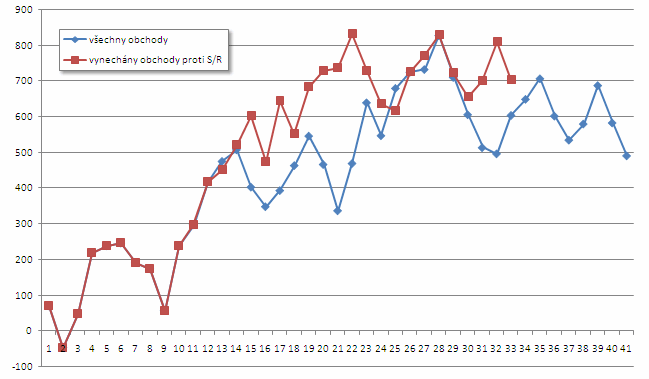 Pavel si například začal všímat, že nejhorší výsledky mu nadělují dny, kdy se trh pohybuje spíš do strany a cena tak proráží stále podobné S/R úrovně nahoru a dolu. Postupem času si do deníku přidal filtr označující situaci, kdy vstupoval do trhu proti již existují S/R úrovni. Níže je graf následného porovnání obchodů s filtrem a bez filtru: