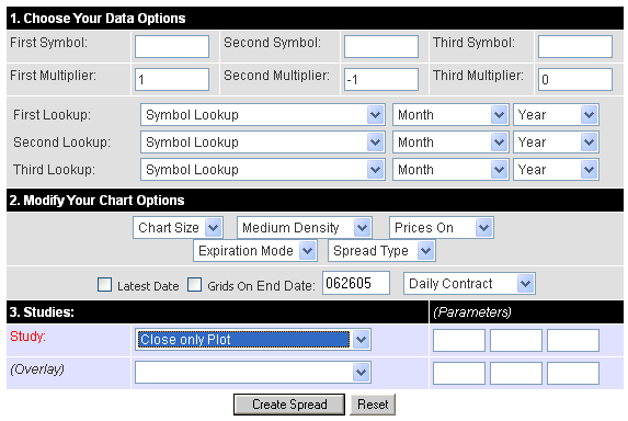 Stejně jako v případě futures grafů, také spreadové grafy jsou součástí množství různých služeb umožňující práci s grafy a různými indikátory. Sám používám zmíněný TnT, a nemám tak v žádném případě přehled o všech nabízených službách, které aktivně nepoužívám. Nicméně zajímavým příkladem se mi jeví Advanced Commodities, nabízející za 20 dolarů měsíčně přístup k nejrůznějším aktuálním i historickým datům, přičemž jedna část služby je věnovaná i spreadům: