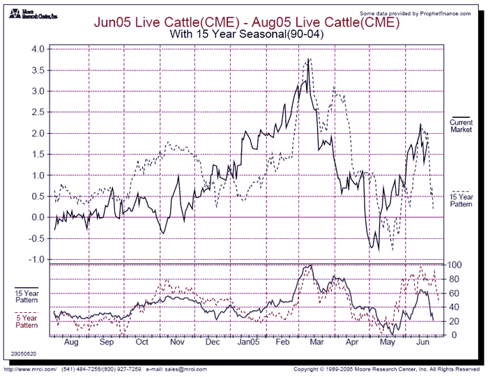 Na posledním dnešním screenshotu vidíte ukázku průběhu grafu spreadu LCM5-LCQ5 tedy mezi dvěmi různými kontraktními měsíci hovězího masa (červen vs. srpen). Graf pochází od společnosti Mrci.com, která v rámci svých služeb nabízí spreadové grafy včetně historických průběhů. V hlavním grafu vidíte šrafovanou čáru vyjadřující patnáctiletý průměr, černá čára je průběh obchodu v letošním roce. Graf snad nepotřebuje příliš komentářů - je vidět, že hodnota 3,5 v polovině března představovala určitý historický top a cena -0,5 dno. Snadno předpovídatelný trend mezi těmito dvěma body představuje ziskový potenciál cca 1800 dolarů při blokovaném marginu 400 dolarů
