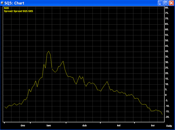 Spread SQ5-SX5 v realtime platformě Barchart. Výhodou je možnost nechat si zobrazit graf spreadu v různých časových měřítkách. Mimochodem - krásný downtrend o celkovém rozsahu cca 3000 dolarů, kterého se bylo možné zúčastnit s marginem cca 350 dolarů