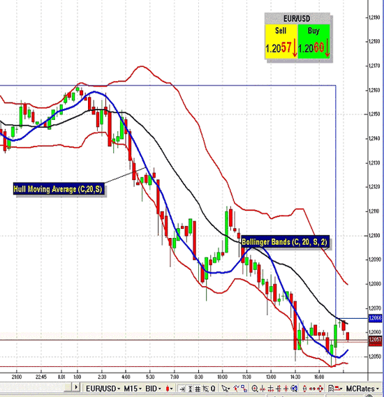 Níže uvedený graf obsahuje indikátor BB ve spojení s Hull Moving Average (HMA – jedna z variant MA). Oba indikátory jsou nastaveny na hodnotu periody 20 – Simple MA. Kombinace BB s HMA využívá při stejné periodě (20) a typu (SMA) vzájemných crossů mezi střední hodnotou BB a HMA, kdy je zároveň sledován vývoj uvnitř BB.