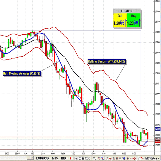 Trochu jinak reaguje spojení výše zmíněného Keltner Bands (KB) ve spojení se stejným indikátorem HMA a stejnými hodnotami. Na příkladu v grafu – v KB je ATR nastaven na standardní hodnotu 14, multiple ATR (odpovídající hodnotám ohraničení pásma v BB) rovněž na stejnou hodnotu 2.