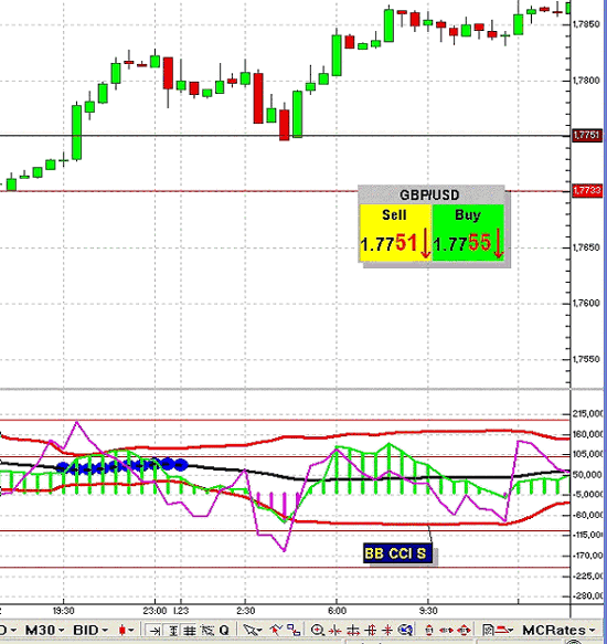 Velmi zajímavým (a hlavně hodně úspěšným) je spojení nebo spíše kumulace BB s Commodity Channel Index (CCI). Protože BB pracuje obvykle v cenovém grafu a CCI v samostatném okně, musel se nejprve BB transformovat do prostředí CCI. CCI obsahuje na příkladu jak standardní nastavení (perioda 14), tak i nastavení „Turbo“ s periodou 6. Tento kumulativní indikátor pod názvem BB CCI S obsahuje navíc ještě tzv. SQUEEZE (SQ) – volně přeloženo stisk, stlačení, namáčknutí, lisování (ve slovníku jsem ale objevil i pojmenování squeeze jako symbol pro nepříjemnou finanční situaci, pro milence a pro ekonomický nátlak – velmi příhodné označení). SQ nám umožní sledovat přiblížení horní a dolní linie BB, a protože je zde CCI vlastně součástí BB, umožní nám SQ sledovat nejen toto přiblížení, ale i vzájemné reakce mezi CCI a BB. Nakonec je SQ i dobrým signálem pro vstup/výstup na pozice nebo i jako měřítko snížené/zvýšené aktivity trhu.