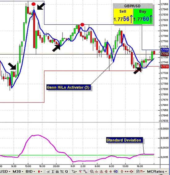 V úvodu jsem zmínil indikátor Standard Deviation (SD). Tento, alespoň podle mne, hodně opomíjený indikátor (asi pro svou jednoduchost) vychází z podobných principů jako BB – aritmetický průměr předchozích close cen a jeho aktuální odchylka. Pracuje nejčastěji ve stejné periodě 20 jako BB (pro FX a kratší grafy se ale osvědčilo i nastavení 14 a nižší). Oproti BB však SD osciluje v sólo grafu kolem hodnoty nula (0) a měří rovněž odchylku momentální ceny od ceny průměrné, která je signálem aktivity trhu. SD obsahuje navíc volně nastavitelný „Filtr level“ (FL). V závislosti na měnovém páru a min. grafu používám nejčastěji hodnoty FL 0,0008 až 0,0025. SD řeší myslím celkem velmi účelně časté dilema traderů – kdy vstoupit na pozici. I když se obchodník může orientovat podle jiných, a daleko složitějších indikací, SD mu dobře signalizuje, kdy je vhodné do pozice vstoupit, ať už Buy nebo Sell. Ve zkratce: má se za to, že když je křivka SD nad hodnotou nula, (resp. FL), je vhodné do pozice vstoupit, když pod FL, pozici neotvíráme. Pokles SD pod hraniční hodnotu FL může být i dobrým signálem pro opuštění již otevřené pozice. Na příkladu je uveden Gann Hilo Activator (GHA) v periodě 3 s filtrací přes SD (v periodě 20 s FL na hodnotě 0,0018). Černé šipky označují možné vstupy na základě indikací GHA, červené tečky výstupy z pozice.