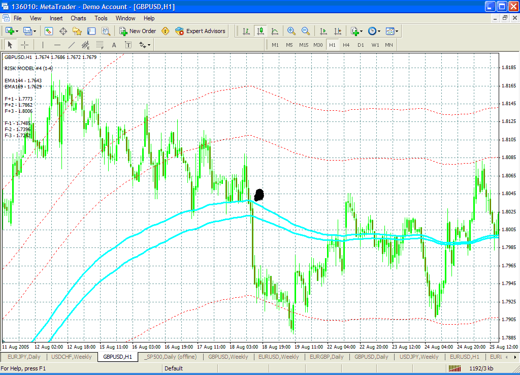 GBP/USD – Model 1 + Model 3. Nejdříve nastavte Model 1 a pak Model 3. Oba modely se budou překrývat a vytvoří 5 fibo linek po obou stranách tunelu. Teď máte fibo čísla 89, 144, 233, 377 a 610 od denního tunelu.