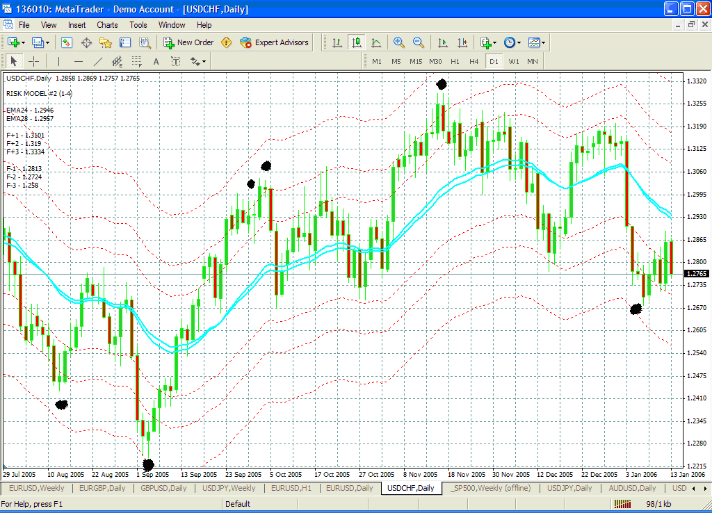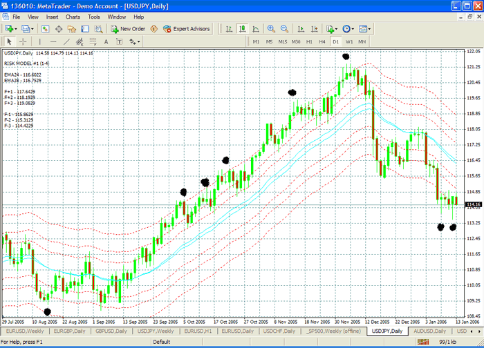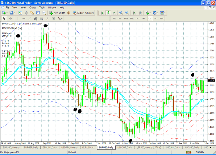 V přílohách k tomuto textu máte grafy pro každý měnový pár od 12. března 2004 do 13. ledna 2006. Na každém grafu je černá tečka. Tyto tečky odpovídají výše uvedeným kritériím.