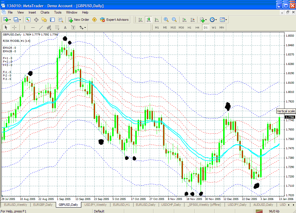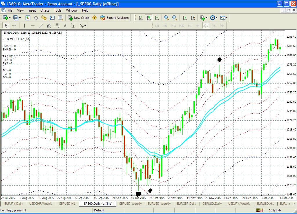 Napsal jsem plug-in „Vegas S&P Daily“ k použití na denních grafech. Vkládá do grafu EMA tunel a fibo úrovně, tři na každou stranu tunelu, podle příslušného modelu. Když otevřete přílohu „Vegas S&P Daily“, máte tam pro MT 4 čtyři modely s různými fibo úrovněmi: