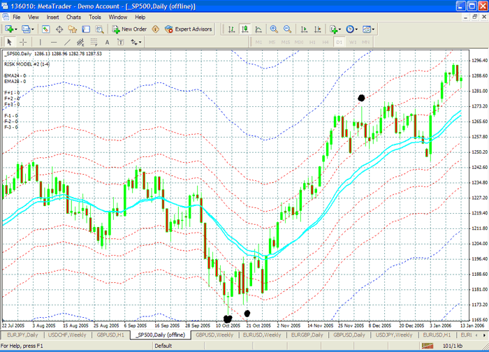 V přílohách k tomuto textu máte grafy pro S&P500 Index od 29. září 2000 do 13. ledna 2006. Šel jsem dál než u měnových párů, takže můžete vidět perfektní bear market v akciích a jak vypadá na grafu.