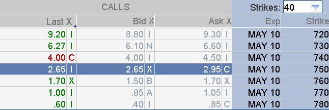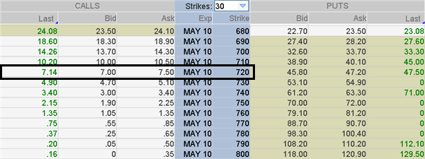 Na obrázku jsem označil cenu pro CALL opci se strike cenou 720. Ze tří sloupců je patrné, že naposledy se opce zobchodovala za cenu 7,14. Pokud bychom chtěli v tuto chvíli opci koupit, opce je k dispozici za cenu 7,50 (připomeňme, že opci bychom tedy nakupovali za 750 USD, protože nejmenší velikost opčního kontraktu je na 100 shares podkladového aktiva). Pokud bychom chtěli opci prodat, nebo vypsat, získáme cenu 7,00.