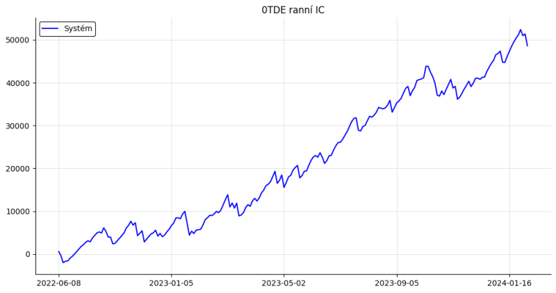 Tentokrát s tím rozdílem, že vypisujeme IC na začátku dne a držíme jej pouze v průběhu seance (nedržíme přes noc). Profit target 45 % inkasovaného prémia, stop-loss 100 % inkasovaného prémia.