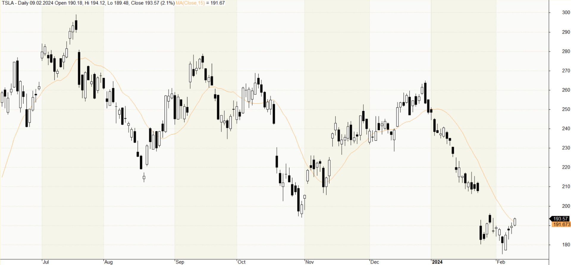Předpokládejme, že tipujete růst akcií Tesly (TSLA), která se v době článku obchoduje na úrovni 193,57 a jejíž cena se začíná zvedat.