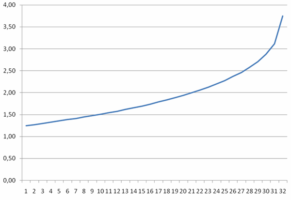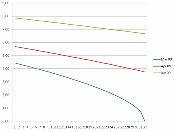 Na první pohled je vidět, že nejvýrazněji klesá modrá čára reprezentující hodnotu opce s nejbližší expirací (březnovou). Jak se blíží expirace, je pokles rychlejší a rychlejší.