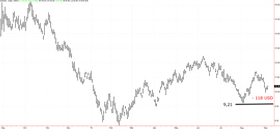 Podobný pohyb můžeme zobchodovat v ETF s názvem USO (podrobně o ETF viz článek Trhy podrobněji: ETFs). Jde prakticky o akcii, kterou můžeme nakoupit v libovolném množství. Řekněme, že nakoupíme do portfolia 100 ks trhu USO. To nás bude stát 1 039 USD (bez marginu, nebo 519 USD s běžným 50% marginem poskytovaným na akcie většinou brokerů). Prostor ke stejné SR úrovni, jako je vyznačená ve futures grafu, pak představuje objem 118 USD:
