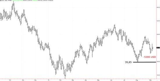 Co znamená páka v praxi, si můžeme ukázat například na grafu ropy. Nejprve její futures kontrakt (CL). Na otevření pozice v tomto trhu vyžaduje například Interactive Brokers margin 3 915 USD (intradenní margin je poloviční). Řada začínajících obchodníků má proto pocit, že si může dovolit obchodovat daný trh například s účtem 5 000 USD, protože broker vám pozici otevře. Řekněme, zcela hypoteticky, že obchodník otevře dlouhou pozici na ceně 45,15 a bude chtít držet například k ceně 50. Adekvátně musí dát takovému pohybu prostor – možná k ceně 40? I s jedním kontraktem ale takový prostor představuje sumu 5300 USD. Tedy dost na to, aby to prakticky vymazalo celý menší účet.