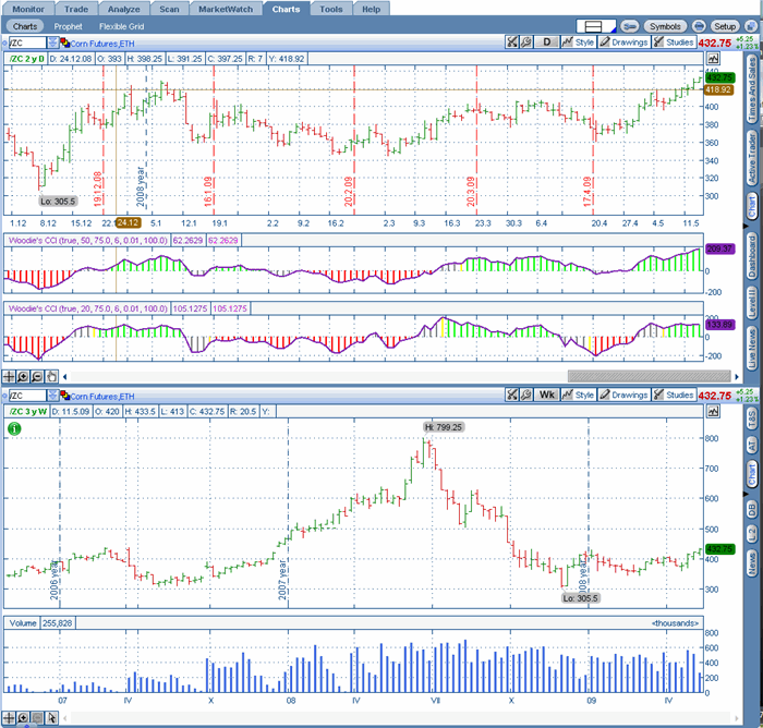 Bezplatnou platformu ThinkorSwim jde dnes použít i coby samostatný analytický nástroj. Na obrázku zobrazen trh komoditního kontraktu kukuřice se šablonou obchodního systému FinWin. Na horním grafu je zobrazen denní graf, na spodním týdenní.
