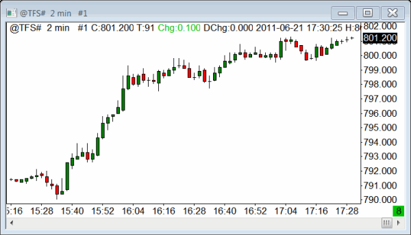 Ukázka typického časového grafu intradenního obchodníka. Trh e-mini Russell 2000, 2 minutový timeframe. Jednotlivé "svislé úsečky" odpovídají cenové aktivitě trhu za 2 minuty. Pokud se trh v dané časové periodě hodně hýbal, je úsečka vysoká. Nízká úsečka znamená, že se cena v rámci daných 2 minut příliš nezměnila.