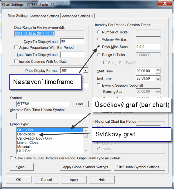 V rámci seriálu budu popisovat nastavení grafů v programu SierraChart, protože jde o software, který sám používám. Pochopitelně však, že zejména u základních typů grafů – jako jsou například dnes zmiňované časové grafy - lze podobné nastavení najít ve všech programech umožňujících pracovat s grafy. V SierraChart se grafy nastavují přes volbu Chart > Chart Settings (nebo horkou klávesou F5):