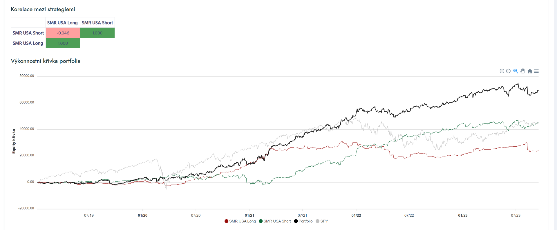 V grafu pocházejícím z dashboardu Trading Room, kde strategii následujeme den po dni, je vidět výkonnostní křivka swingové strategie SMR long (červená linka) a swingové strategie SMR short (zelená linka). Ani jedna z těchto samostatných strategií index v podobě S&P 500 (šedá linka) výrazně nepřekonává. Jinak je to u celkového portfolia složeného ze SMR long a SMR short (černá linka). Celkem index (S&P 500) překonává výrazně.