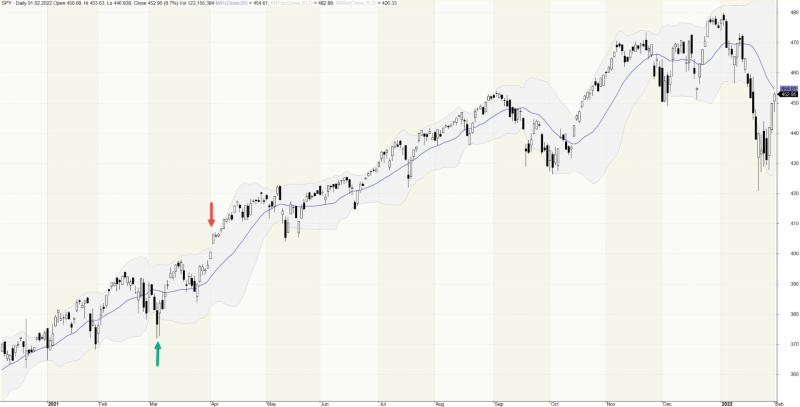 Na denním grafu je zřejmé, že trh prakticky nepřetržitě trendoval vzhůru (rostl). Současně se ale „pohupoval“, swingoval, okolo modré linky. Konkrétně v šedě vyznačené pásmu. Modrá linka představuje klouzavý průměr počítaný z posledních 20 denních uzavíracích cen (tedy průměrnou dvacetidenní cenu), šedé oblasti jsou pak definovány indikátorem Bollinger Bands. Tento indikátor počítá horní a spodní část šedého pásma jako rozdíl dvou standardních odchylek cenového pohybu od středové průměrné ceny.