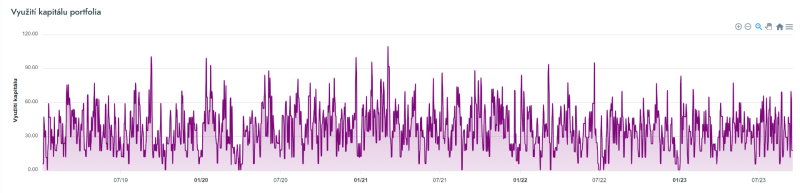 Vidíme, že přestože nastavené „portfolio“ (long a short strategie SMR) překonává index, stačí mu pro to průměrně využívat stále jen cca 50 % kapitálu (v grafu je vidět, že hodnota využití kapitálu nejde přes 100 % a není tak využíván ani margin).