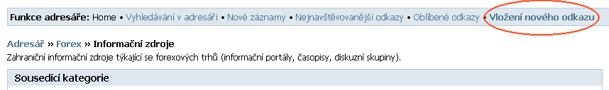 V adresářové struktuře nalezněte pro odkaz vhodnou rubriku, a poté klikněte na link Vložení nového odkazu.