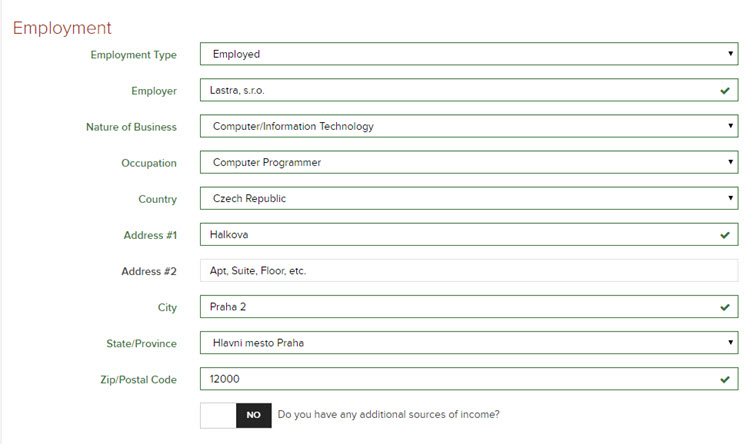 Pozor! Pokud uvedete, že jste nezaměstnaný (Unemployed) nebo v důchodu (Retired) s velmi malými příjmy, s vysokou pravděpodobností nebude váš účet schválen.