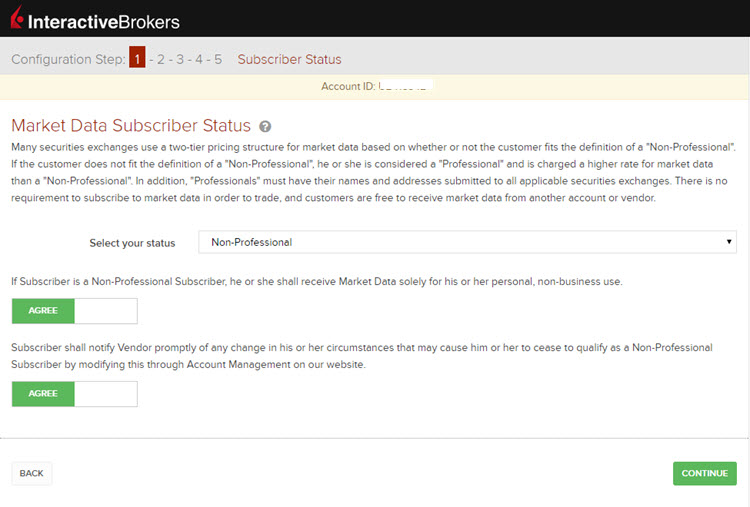 Spolu s registrací účtu InteractiveBrokers ihned nabídne přechodem do dalšího formuláře možnost konfigurovat základní nastavení účtu: Vyberte si, jestli se na vás z pohledu předplatného dat aplikuje status Professional nebo Non-Professional. Domácí obchodníci/jednotlivci mají vesměs status Non-Professional (a levnější data):