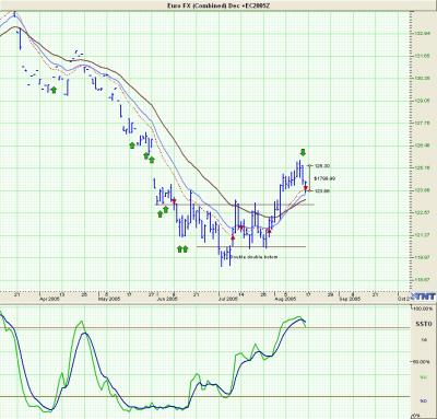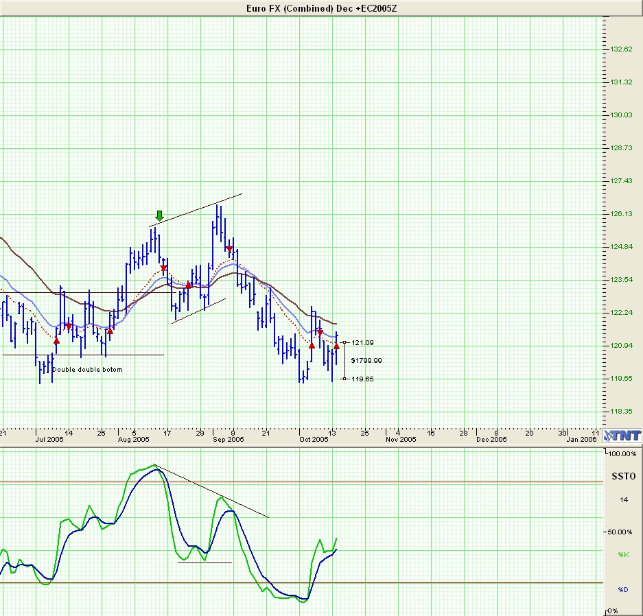 Obchodní plán Můj obchodní plán požítá s hodnotou ůčtu 10000$ A použítím indikátoru SSTO. Při delším pozorování měnových grafů jsem si všimnul, že se grafy na měnách pohybují v jistých skoro simetrických vlnách a na základě tohoto pozorování jsem založil svůj obchodní systém(viz obráze). Toto pozorování jsem skloubil s indikátorem SSTO. Jestliže se indikátor vyšplhá nad 80% hranici a začne se otáčet směrem dolu a protne přitom 80% hranici směrem dolů zadávám Sell příkaz pod low posledního dne. Jestliže se příkaz vyplní zadávám Stop loss "na dvě pozice" nad vrchol formace což výchází nekde kolem 1800$ po 3 až 4 dnech posouvám Stop loss ze základní úrovně buď na korekci nebo po Ema 19. Což dělám tak dlouho pokud není protnut můj Stop loss a tím pádem dojde k otočení pozice a celá operace s posouváním stop lossu se opakuje. Tento systém jsem zkoušel na Euru a Jap Yenu od roku 2000 až po teď a nevětší série ztrát byla 3 po sobě jdoucí. Dále jsem vypozoroval, že jedna vlna se pohybuje od mého otočení u Eura asy 2700$ do plusu než dojde k dalšímu otočení. Proto jsem se rozhodl zkusit tento systém obchodovat se 3 pozicemi. Kdy 2 pozice odzaziji na zisku cca 2700$ zisku na pozici a třetí pozici zase tahám po Ema19 a tam otáčím pozice zase na 3. Tento systém, ale vyžaduje větší hodnotu účtu nak, kterou si musím ale vydělat. Úzpěšnost tohoto systému je jak již jsem uvedl v diskusi na Triple screen II 71,62%.
