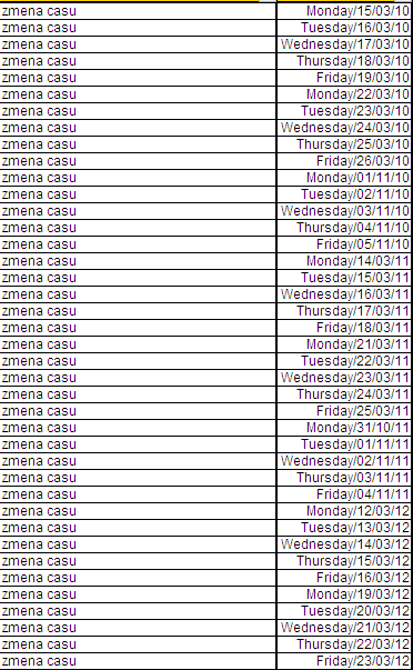 rene.skolnik vid prilozena tabulka v dni ktorych datumy su v nej, je zmeneny cas obchodovania a teda obchodna session cme na indexoch zacina o 1430 a konci o 2115 ceskeho casu, vsetky ostatne datumy sa obchoduje od 1530 do 2215 mam aj dlhsiu historiu ale to bude hadam stacit kazdy rok sa to priblizne opakuje, len datumy su trochu ine mam to zo svojich testov, kde som si to znacil inac najdes to aj tu len je to trosku komplikovane http://www.timeanddate.com/time/dst/2012.html da sa ist roky rokuce do historie a pre kazdu krajinu osobitne