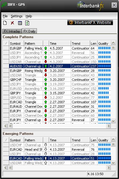 Nevedel som kam presne toto dat, ale aj to je tip k vyvoju menovych parov. Ak cirou nahodou niekto nepozna, program od IBFX, vola sa to GPS, ktory sa snazi identifikovat niektore zakladne technicke patterny v grafoch. Je to rozdelene na denne grafy a intraday (1H, 15M, atd.). Ma to hlavny panel, v ktorom su priebezne aktualizovane patterny. Dve zalozky obsahuju uz spominane daily a intraday patterny. Zalozky su rozdelene na dve polovice. V hornej polovici su uz dokoncene patterny, v spodnej len tie, ktore sa prave vyvijaju. V tych dokoncenych je mozne pozriet, ako sa v historii dokoncili (je tam vysedena plocha s predpokladanym targetom). Program automaticky notifikuje malym okienkom, ked sa aktualizuje situacia. Ak nemate live ucet u IBFX, je mozne pozriet zoznam patternov a v pripade ne-majors, aj detailne samotny pattern. Pre live sa zobrazuje vsetko. Prikladam screenshot hlavneho panelu ako aj detail jedneho patternu. Snad to niekomu pomoze pre orientaciu, ak to niekto nepozna.