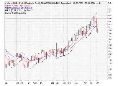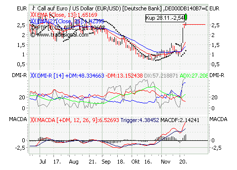 Př.1 - konec obchoduprodej Euro/usd---call DE000DB140B7---strike1300---exp.16.03.07 Kup:--------28.11.06---100ks---2,54---celkem 254+10popl = -264eu prodej:-----06.11.06---100ks---3,39---celkem 339-10popl = +329eu Bilance: + 65ue = 65/254 = 25% zhodnocení investice za 6ní Proč prodej: parabolic sice stále táhne dál, přibližuje stoploss kurzu ale viz níž DMI co dělá. Indikátor DMI: on ten vstup nebyl jen tak náhodný a jen dle parabolic :-) Jeden z velmi silných kupních signálů, jež nebývá moc častý, je otočka jinak klesajícího ADX nahoru a protnutí -DX zespodu nahoru. Pokud se objeví, pak víc než často long je trefa do černého, kolikrát i v takto zdánlivě už nahoru vyšponované situaci, jaká byla při koupi.