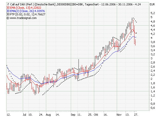 příklad warrantu na německý index DAX (jsou velice pilně obchodované, velký výběr) I ten, kdo by se jen "tupě" držel pouze a jenom indikátoru Parabolic SAR, nepřijde o gatě. Z kurzů wrt napravo vidno že i wrt umí investici velmi rychle podstatně zhodnotit, až násobně-přitom zde jde o wrt ne moc páčený. Nekonečné hledání jakéhosi zázraku na zaručený zisk bývá často jen ztrátou času - subj.pohled. Jsou tací, co otáčejí tam a zpět = call/put = long/short neustále jednu či pár věcí. Mají je už v oku, šetří oči, zadnici i čas. Nekonečné možnosti výběru - i warrantů - mám pocit že na mnohé působí jak pohled kobry do očí kořisti: ta ztuhne...a nic...(maximálně kliká tam a zpět :-) graf www.tradesigalonline.com
