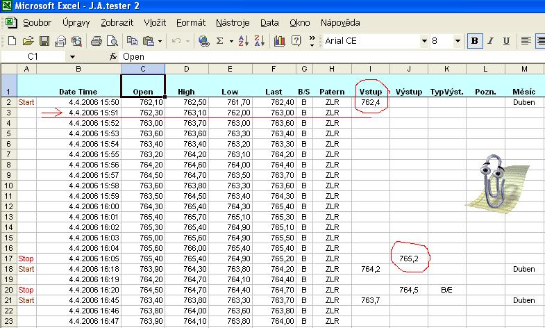 Dobrý večer Alecu asi už spíte, ale přeci se zeptám: otázka bude docela složitá, ale snad to sesmolím... uvedu to na příkladu: testuji v J.A Testeru ER2 při zadání určitých pravidel mi to vyhodí určité výsledky, nu a já jsem potom tyto výsledky testoval na Playback v programu Bracket trader jestli mi tyto výsledky vyjdou stejně. V J.A Testeru jsem zadal PT 3 ; SL:0,8 posun BE po jsem zadal 0,3 a BE+ 0,3. V J.A Testeru dne 4.4 2006 v 15:50 jsem vztoupil do trhu a J.A Tester mi ho vyhodnotil - jak tento obchod dopadl: vstup na 762,4v 15:50 a výstup na 765,2 v 16:05 viz obrázek..., ale Bracket Trader při zadání stejných podmínek mi vystoupil z trhu dříve! a to na hodnotě BE+0,3 tj vztup na 762,4 a výstup na 762,7. když jsem se díval do sešitu DATA viz obrázek tak průběh ceny tj. Open;Hight; low; Close dne4.4.2006 čas 15:51 dáva za pravdu Bracket traderu, protože cena vyskočila nahoru, ale poté se i trošku vrátila tak že došlo k výstupu na BE+3, ale J.A Tester to nevzal a pokračoval dále v otrvřené pozici... snad jsem tu otázku položil srozumitekně... podotýkám, že jsem to zkusil i s vypnutím testovat na PT a výsledek je stejný...