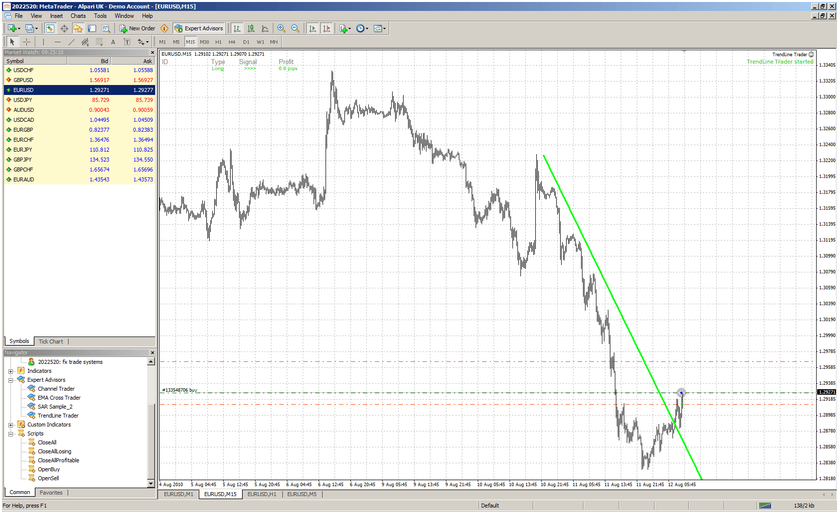 Ahoj, hledáš "Trendline EA" [ital]Automatický obchodní systém Trendline vychází z trendové linie, kterou si sami do grafu zakreslíte. Po proražení trendové linie o předem stanovený počet bodů vykoná robot obchod o stanovené velikosti (+ zadá stop loss + výběr zisku) [/ital] . Najdeš na ****v sekci Nástroje