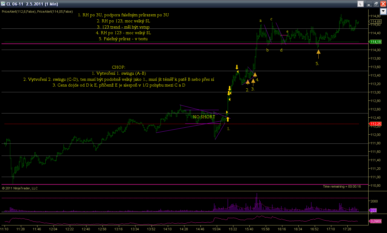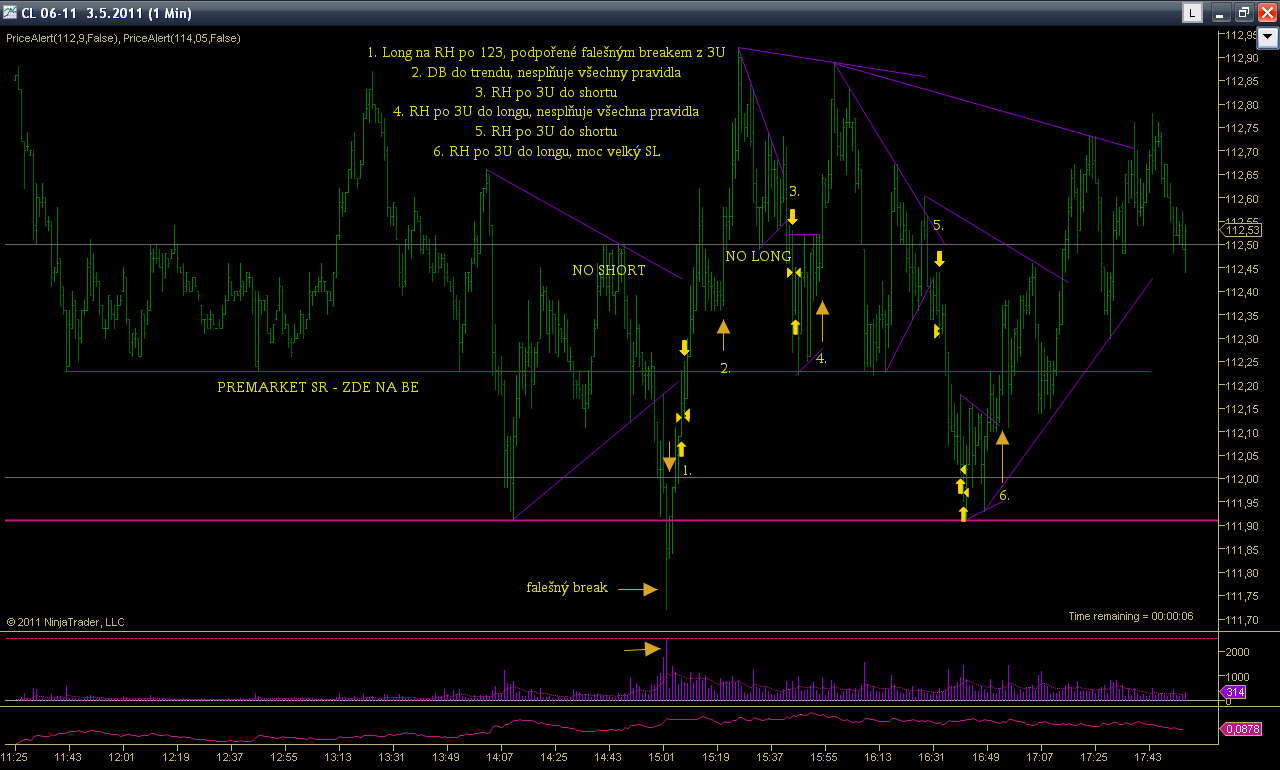 Pekne vstupy na rope, dobre jsi ji "podojil"! :) Normalne bych rekl, ze to nebyl zase tak jednoduchy den na obchodovani, ale po tom tvem screenu.. :) Ja dneska videl take dost vstupnich mist, ale nektere okolnosti me do obchodu nepustily. Navic u prvniho obchodu si snad nekdo vylozene dosel pro muj posunuty SL. 1 kontrakt byl vyplneny na mnou zadane urovni a zbyvajicich 5 s pozitivnim skluzem.. :) Jinak po otevreni opet velice podobna sitauce jako vcera, cena prorazila 3U do shortu, byla rychle odmitnuta, dnes i za dost silneho volume (coz bylo i diky prurazu premarketu) a pak si to pekne padila do longu. Nyni mam rozdelany vstup jeste drive po takto falesnych prurazech, aby mi neujelo silne momentum, ktere potom casto nasleduje. Zitra nejspis obchodovat nestihnu, mam nejake vyrizovani.